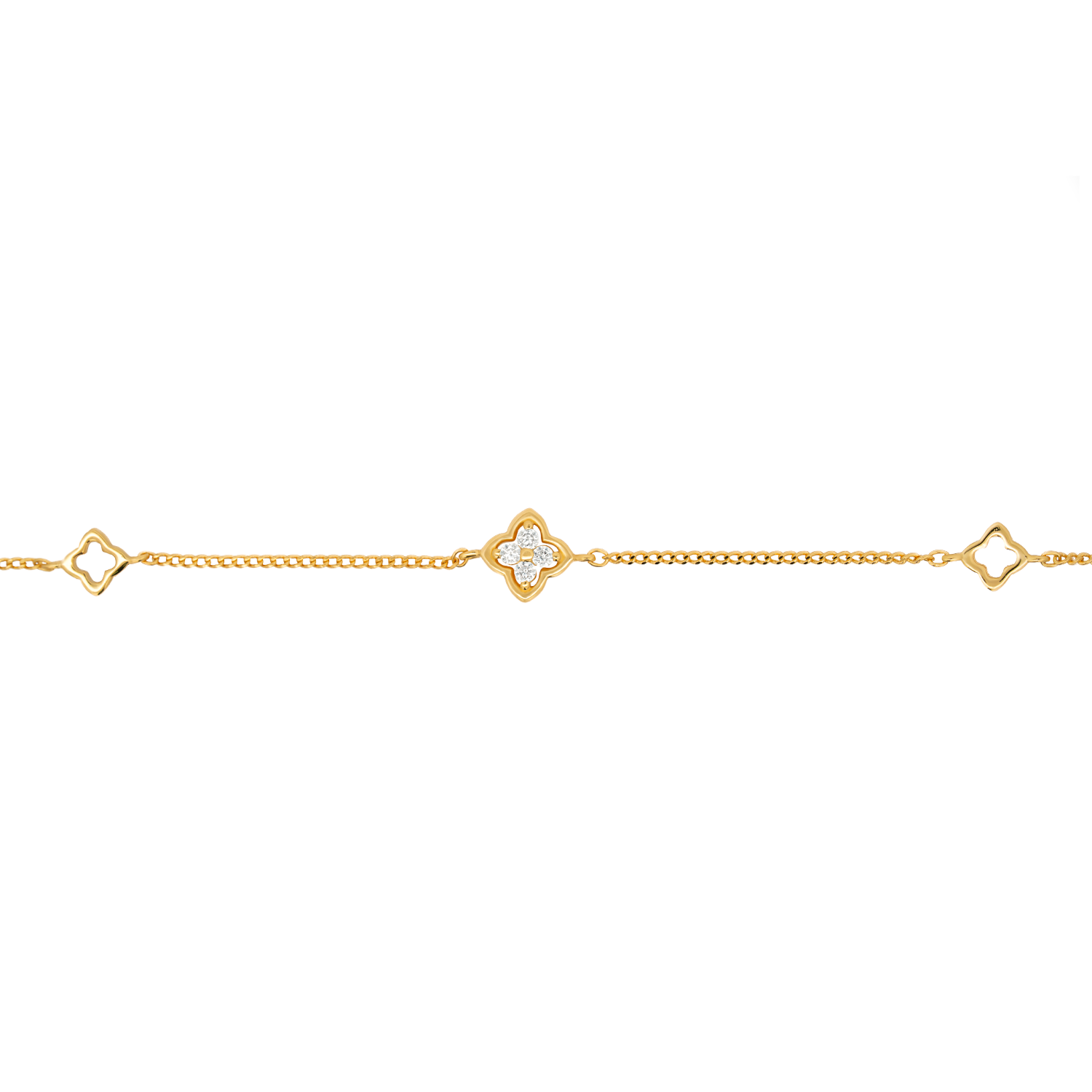 Flourish's four leaf clover-inspired motif is adorned with cubic zirconia stones and sits in between two similarly shaped cut-outs. This trio of four leaf clovers add the perfect amount of sparkle and charm to your everyday.