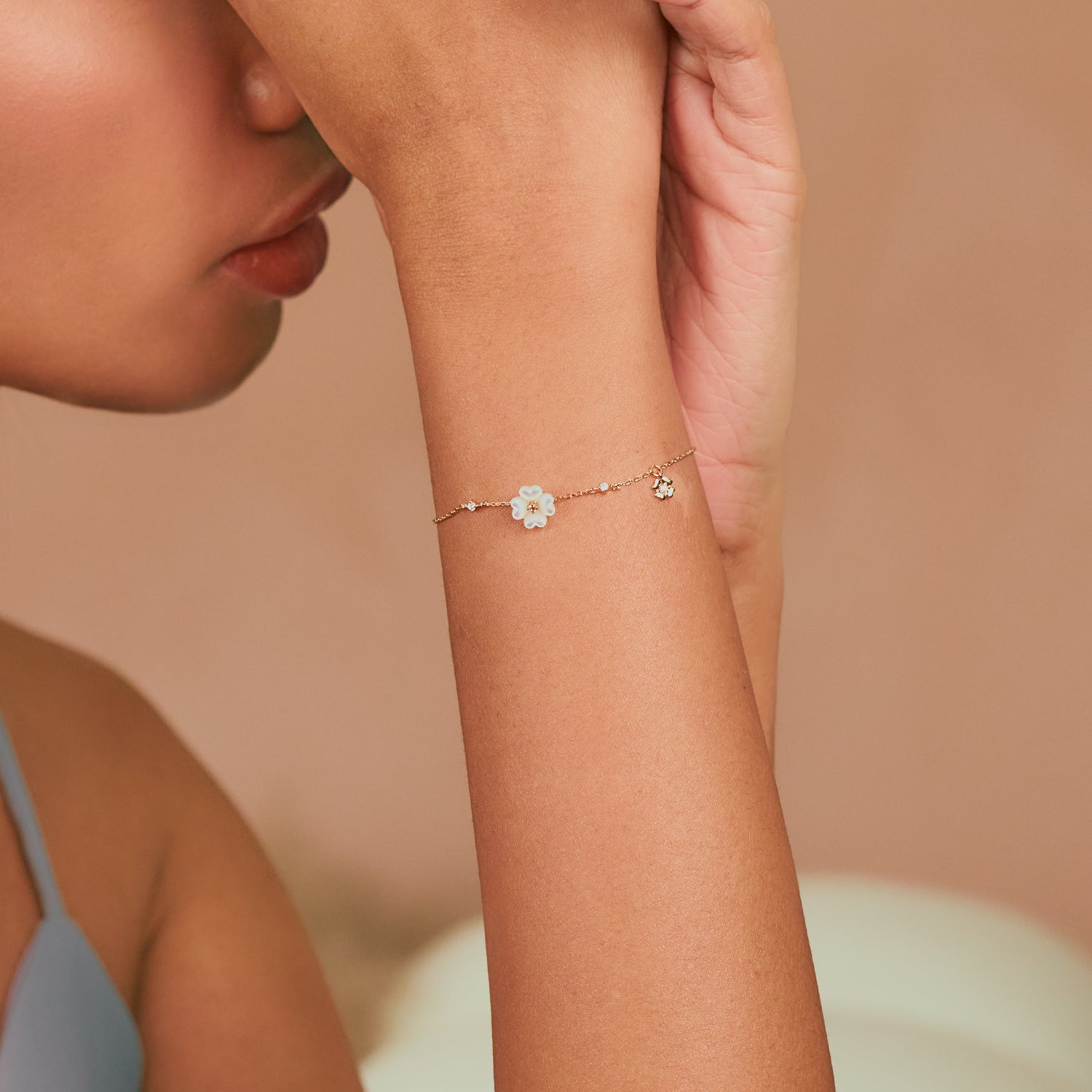 The main mother of pearl floral pendant on Fortuna is complemented by a daintier floral motif. Pair it with its matching necklace and earrings to complete the look!