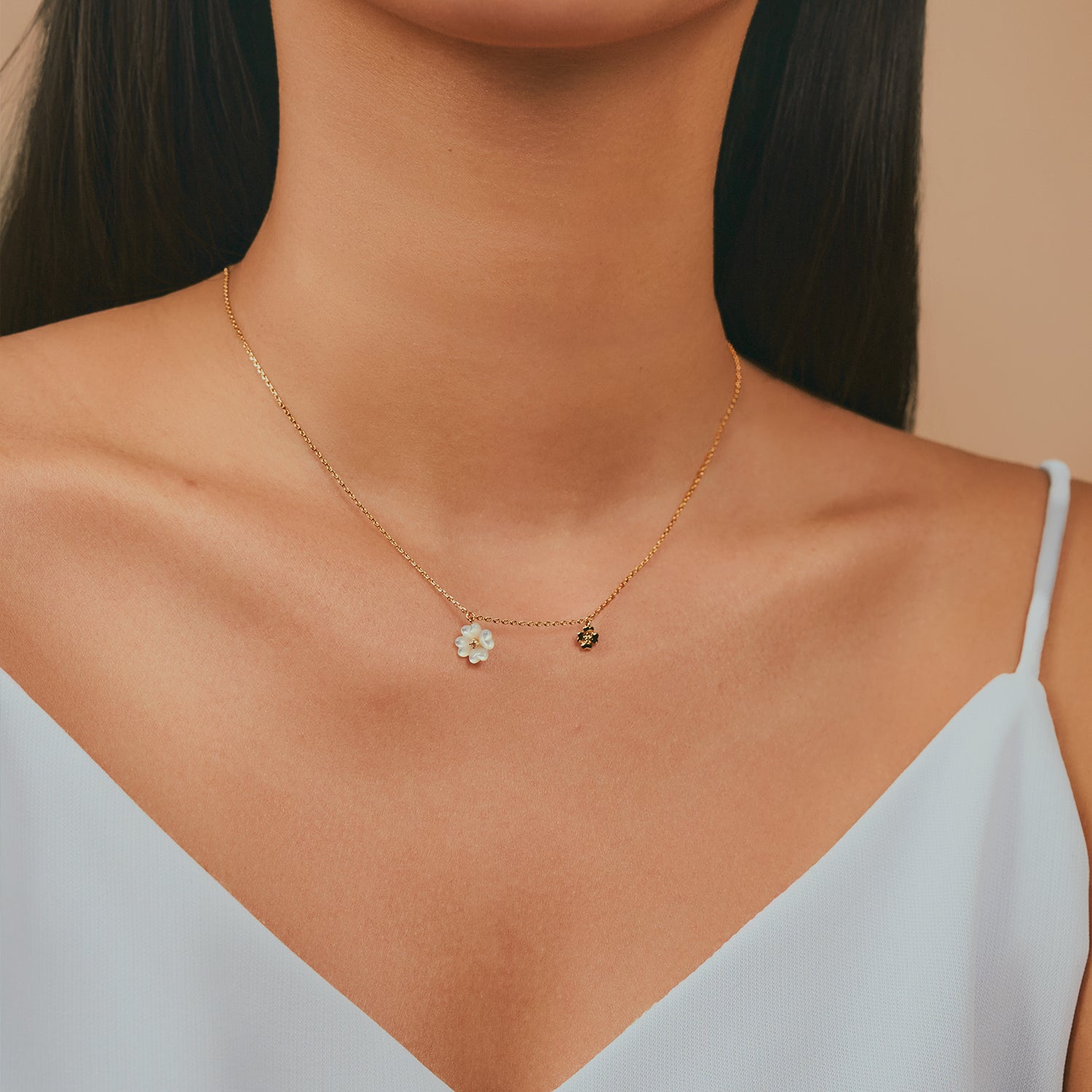 This darling double charm necklace features a main mother of pearl blossom and a daintier petal pendant for just a touch of extra sparkle. Pair it with its matching bracelet and earrings to complete the look!