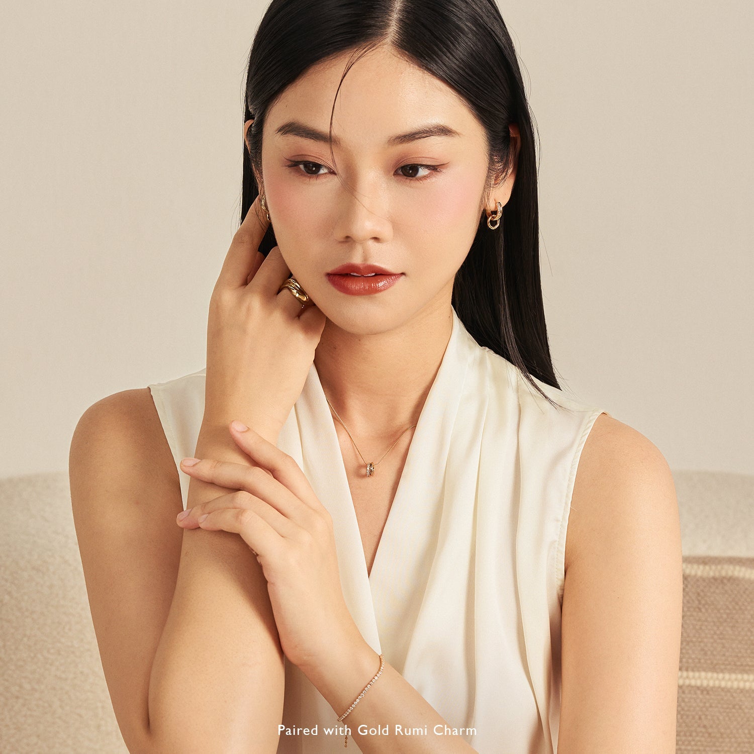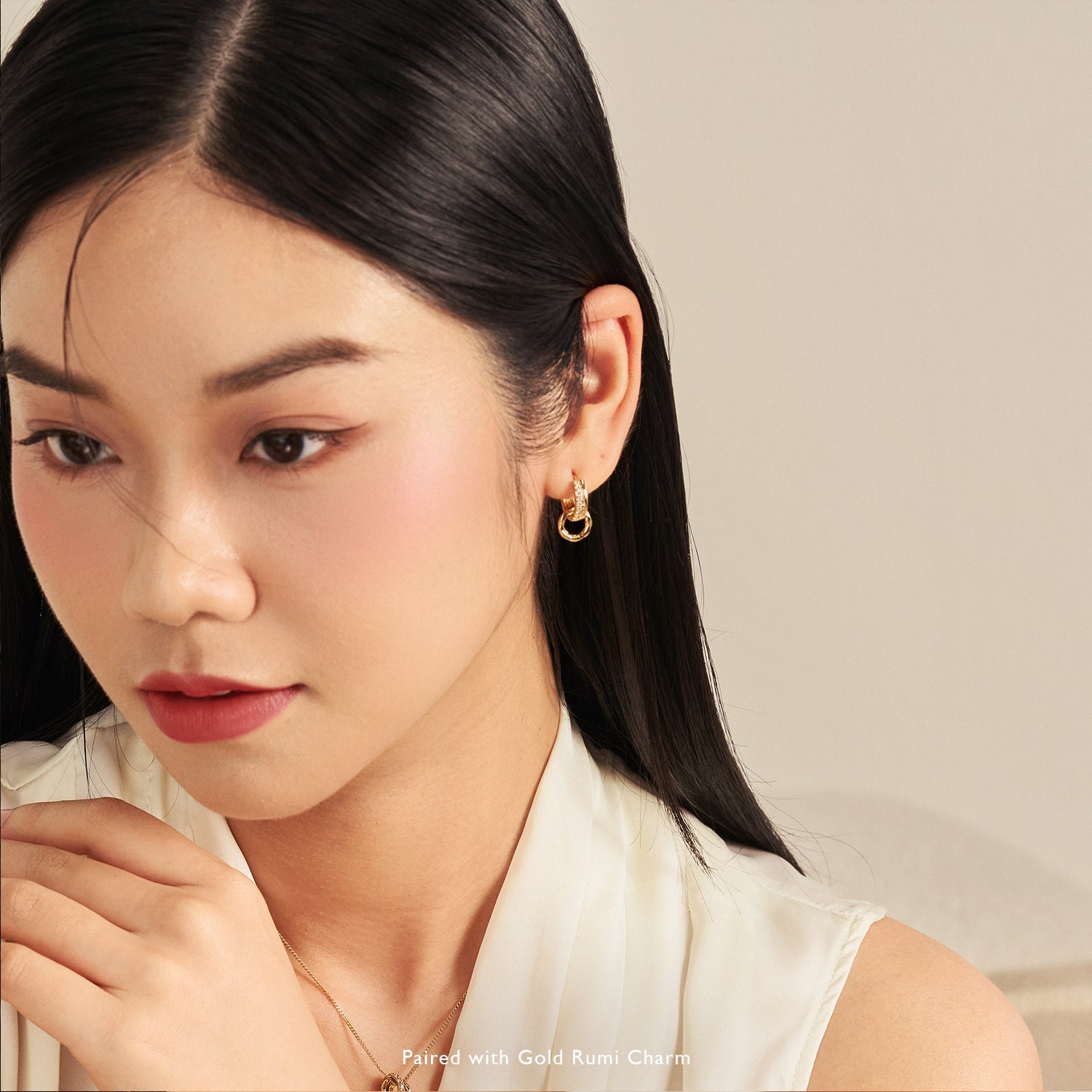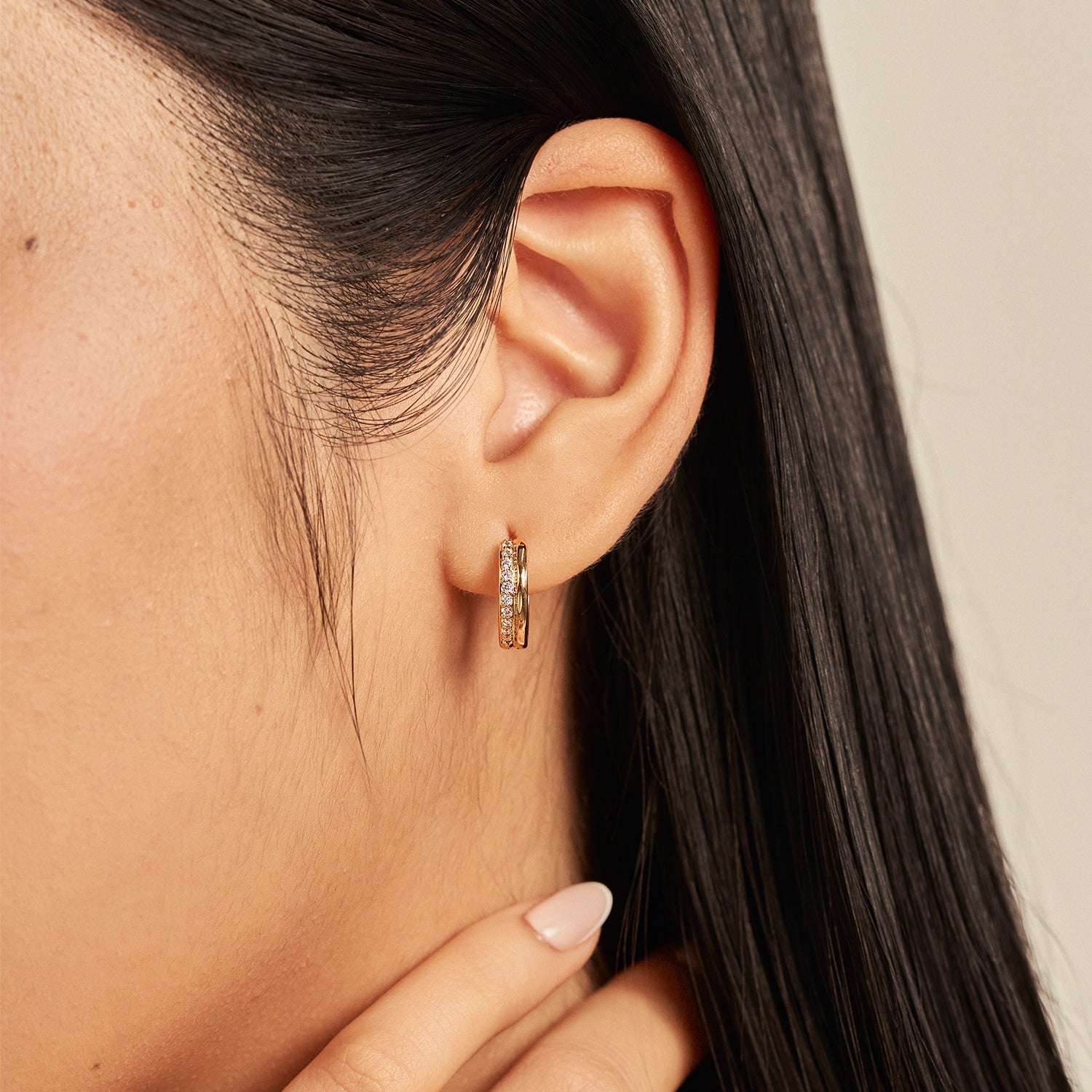 With its cubic zirconia-encrusted front and unembellished back, Jazette can be worn two ways! Add on charms to transform these huggies to drop earrings.
