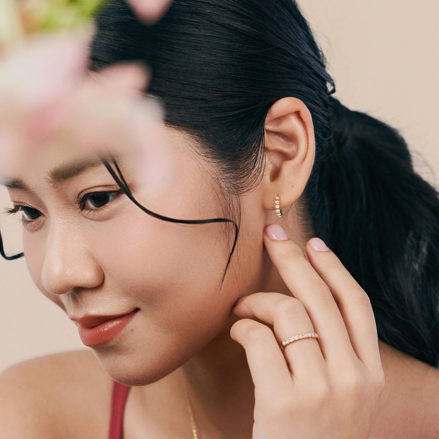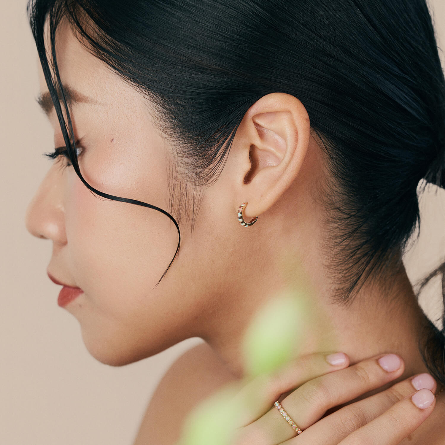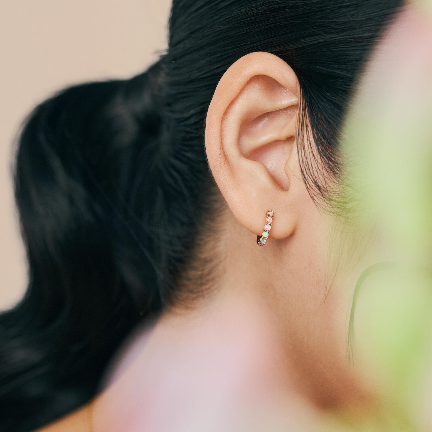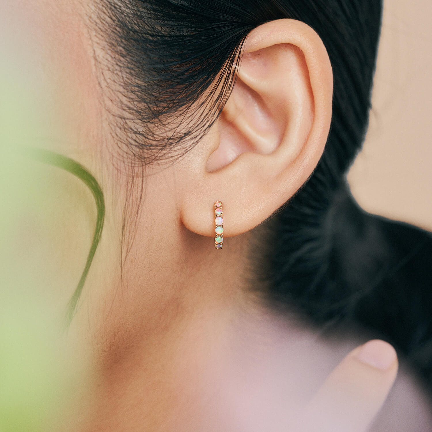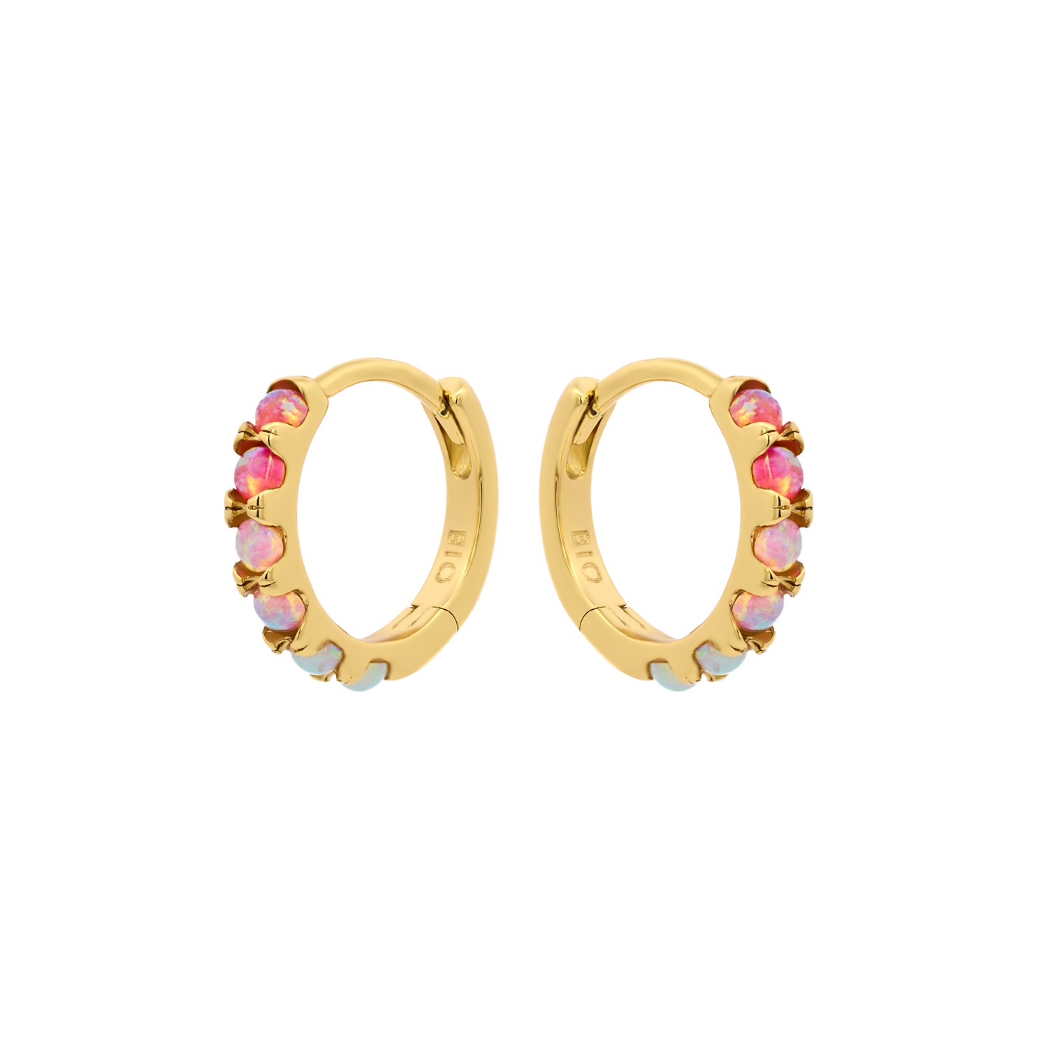 Add a pop of pink with Ophelia. Encrusted with opal, the prismatic pink-to-white gradient on these huggies shifts and dances under light.