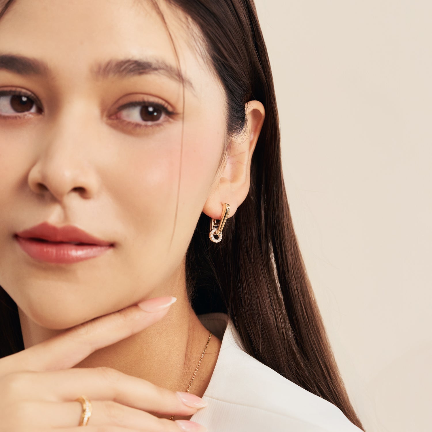 Edge and elegance cross paths in Zuri, a truly versatile piece inspired by can tabs. Featuring two circular rings, one encrusted with cubic zirconia stones and one unembellished, both charms can be removed. Wear Zuri as you like.