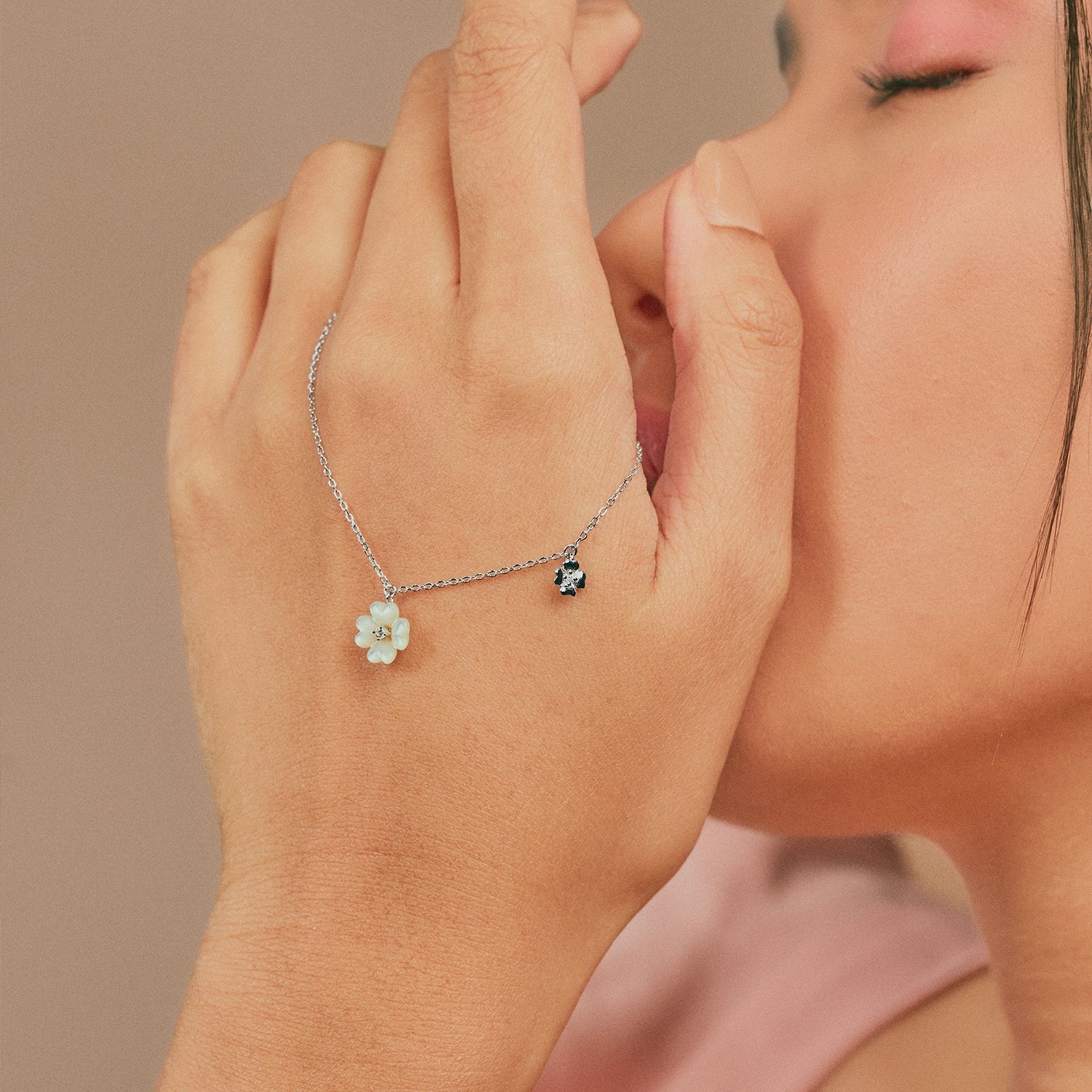 This darling double charm necklace features a main mother of pearl blossom and a daintier petal pendant for just a touch of extra sparkle. Pair it with its matching bracelet and earrings to complete the look!