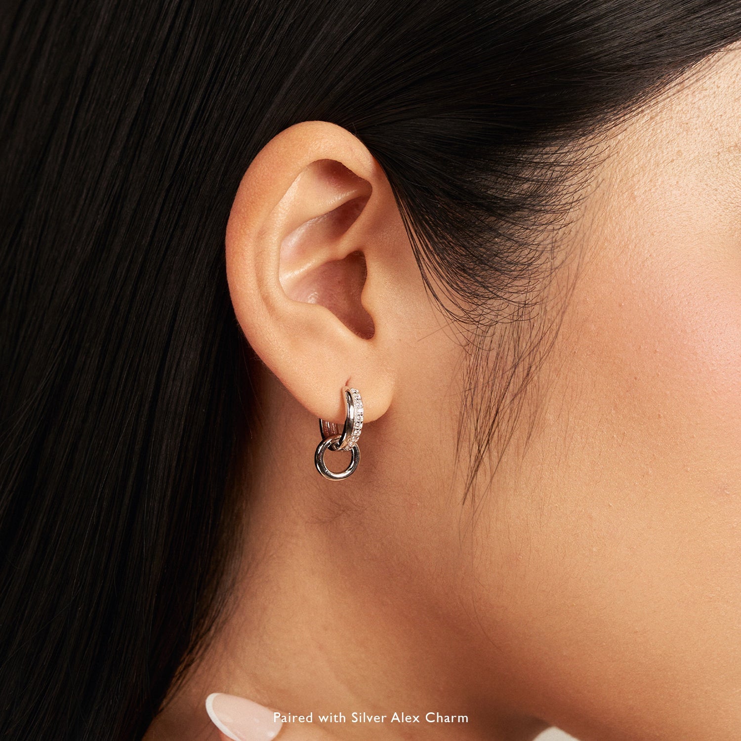 With its cubic zirconia-encrusted front and unembellished back, Jazette can be worn two ways! Add on charms to transform these huggies to drop earrings.