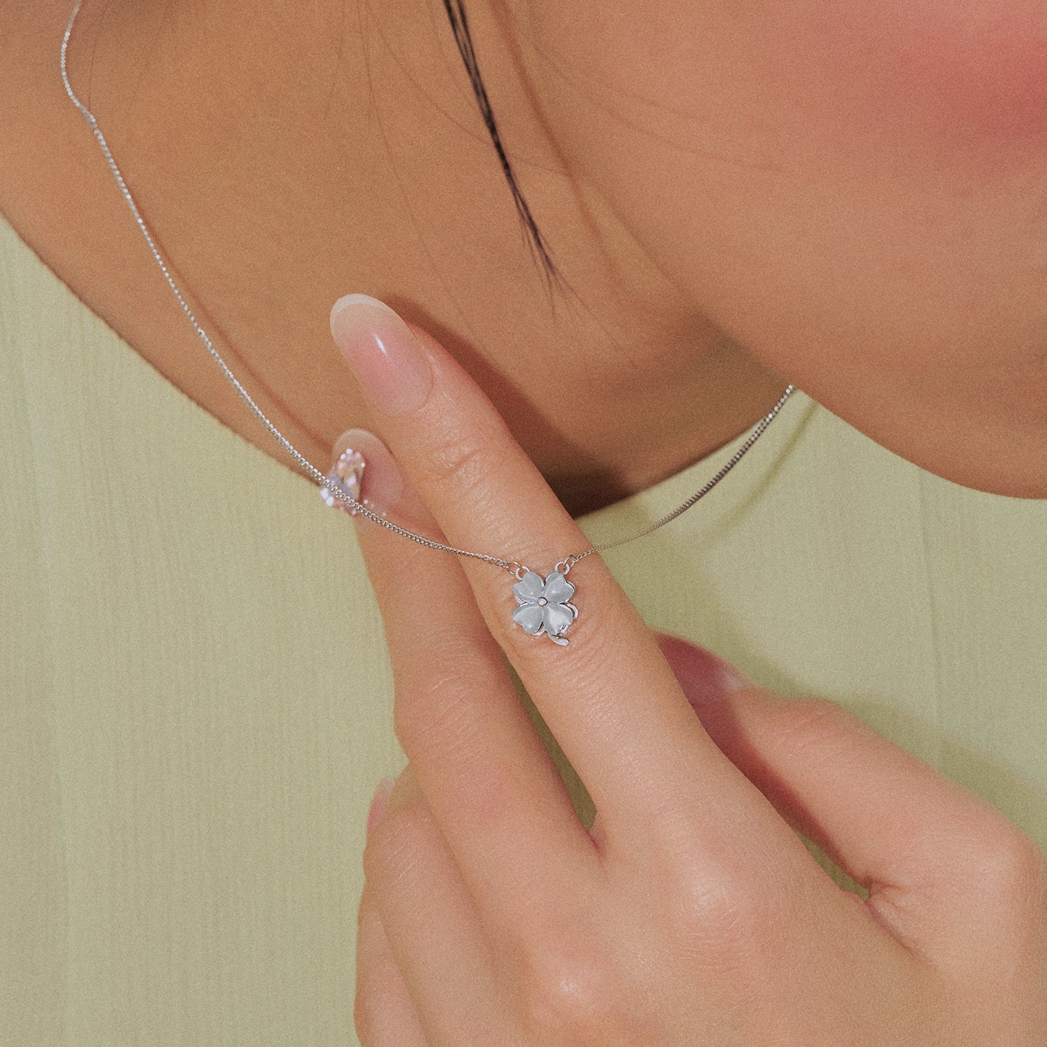 The Lucky Swivel Necklace is a truly fun piece to adorn. The four leaf clover pendant features heart-shaped petals and an amusing swivel mechanism to keep your fidgety self entertained. Take your pick from shimmering shades of white, and blue. The luminous cat's eye effect on the four leaf clover pendant is bound to leave you mesmerise as it spins and turns.